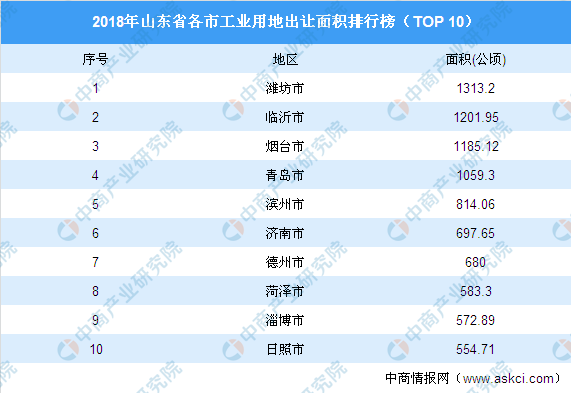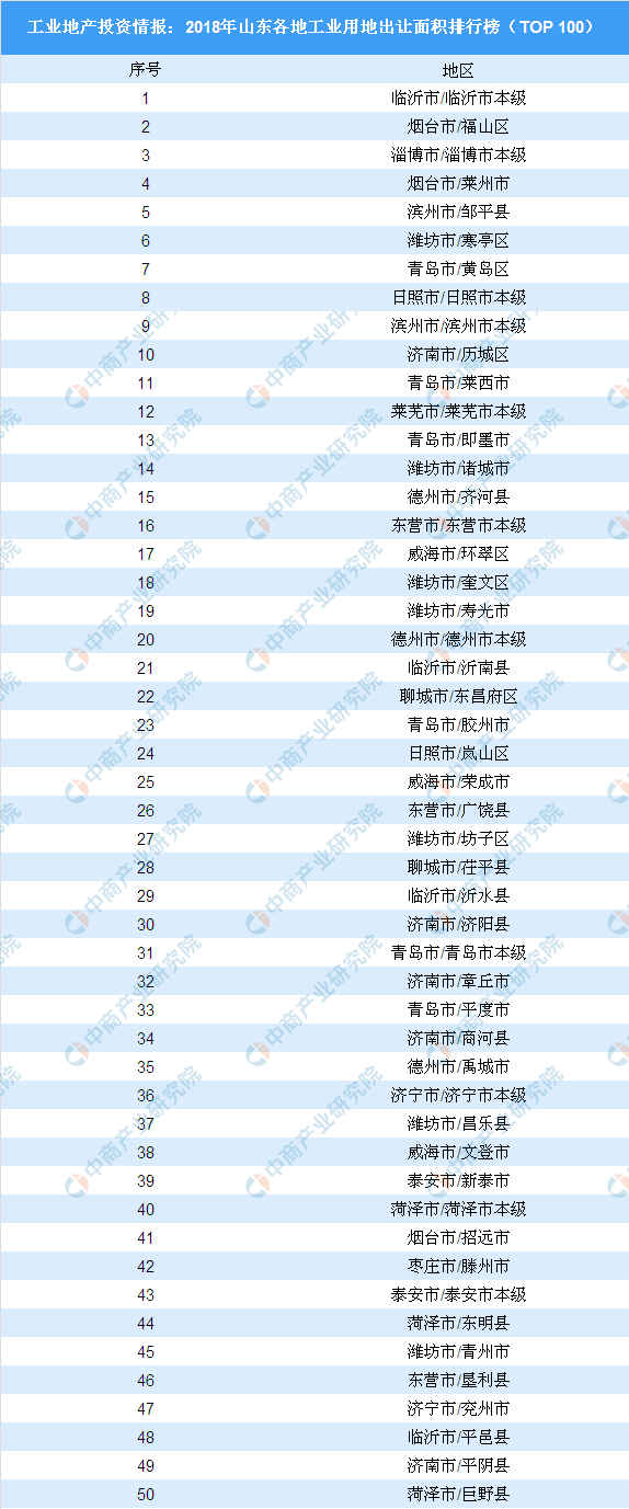工业地产投资情报:2018年山东省各地工业用地出让面积排行榜(TOP 100)