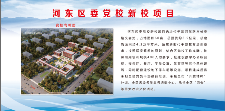 河东区委党校新校项目选址太平街道,位于滨河东路与长春路交会处,占地面积60亩,总建筑面积约4.3万平方米。