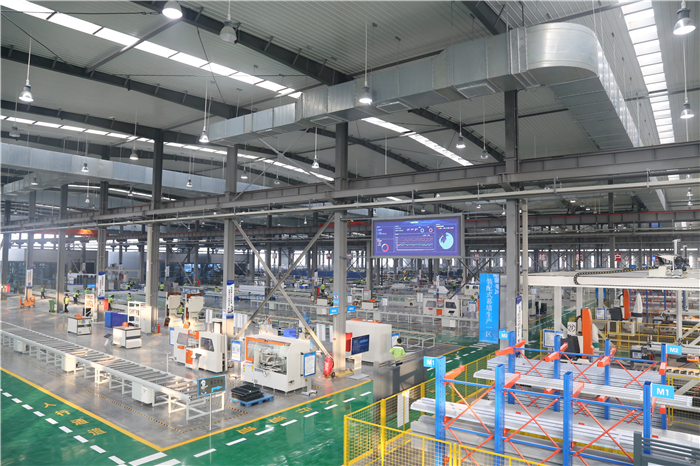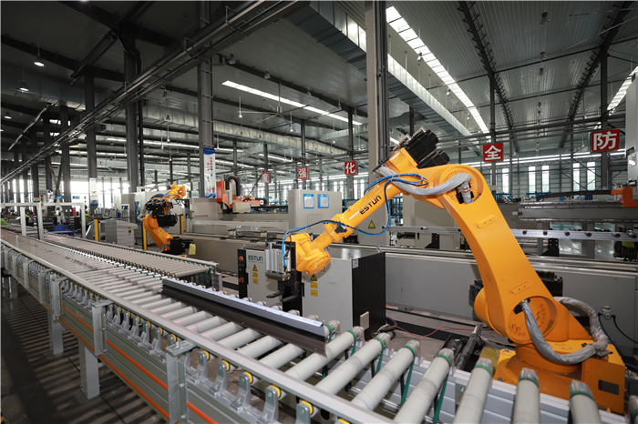 走进生产车间,厂房里机器发出阵阵清脆的抓取声,各类机械臂、大型激光切割机等设备,正有序地穿插作业,不一会儿功夫,一块用于房屋装配的玻璃门窗就正式下线,准备发往项目一线。
